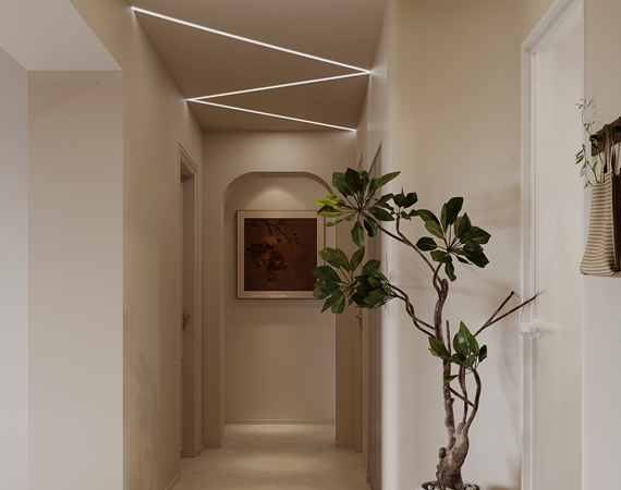 本案为一座580平米的意式轻奢风格别墅,将现代简约与奢华质感完美融合。入户区域便定调了整个空间的非凡气度:对称式的高大木质收纳柜沉稳大气,其间形成的通透走廊自然地引导视线向内