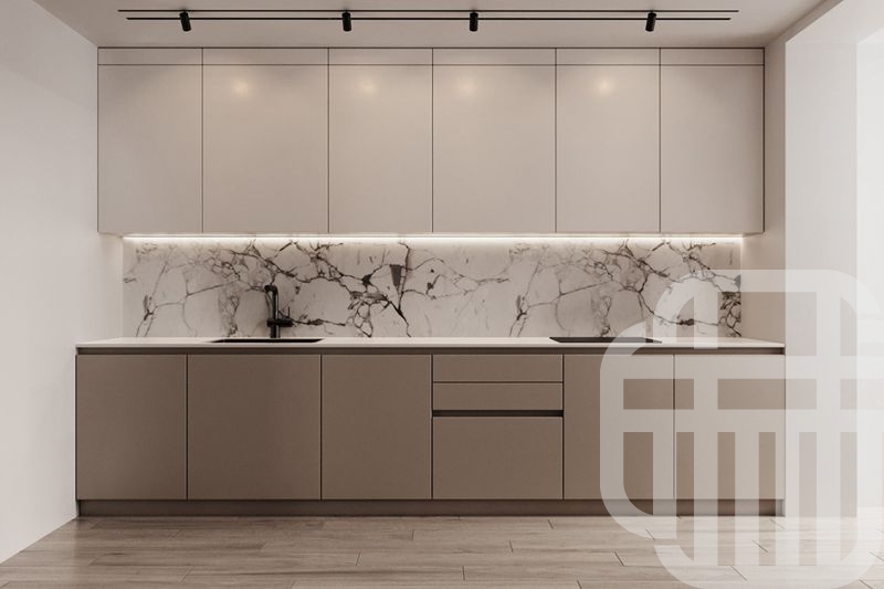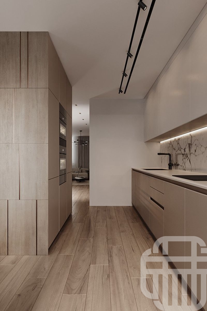 厨房采用U型布局,利用拐角面积,提升空间利用率。上方的白色橱柜与下方的原木色橱柜相呼应,干净整洁的同时,又有充足的收纳空间。