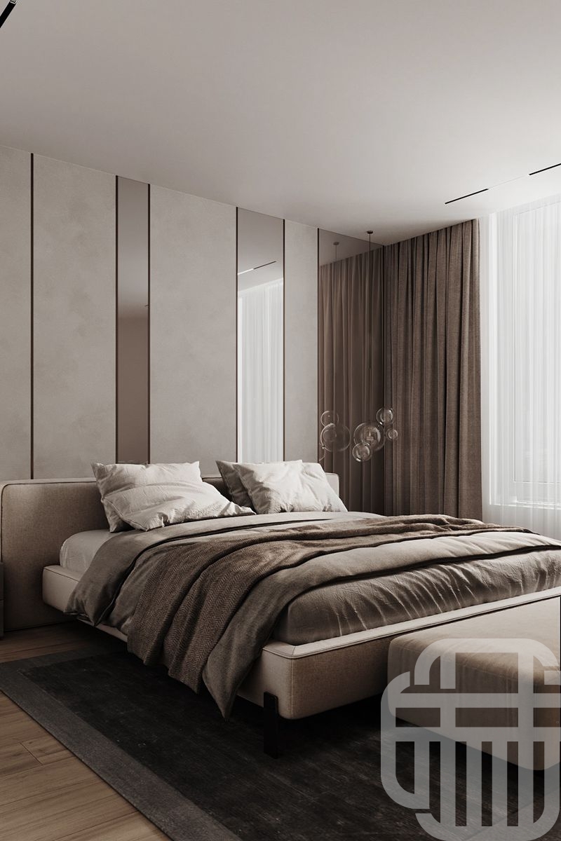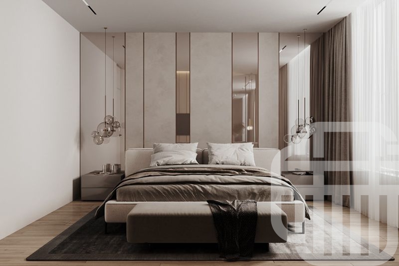 卧室的床采用地台式设计,打破了床+衣柜+床头柜的传统模式,它让卧室看起来更宽敞,也更具整体性,它将床头柜与床融为一体,降低居室的重心,让居住者内心充满安全感,也将空间利用极致。